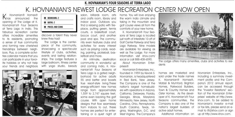 The Lodge offers many amenities, clubs and activities to residents homes are marketed and sold under the trade names K. Hovnanian® Homes®, Matzel & Mumford, Brighton Homes, Parkwood Builders, Town & Country Homes and Oster Homes. As the developer of K. Hovnanian’s® Four Seasons communities, the Company is also one of the nation’s largest builders of active adult homes.
