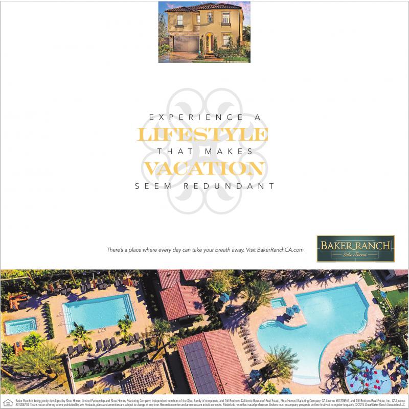 Baker Ranch is beingjointlydeveloped by Shea HomesLimited Partnershipand Shea Homes Marketing Company, independent members of the Shea family of companies, and Toll Brothers. California Bureau of Real Estate, Shea Homes Marketing Company,CALicense#01378646, and Toll Brothers Real Estate, Inc., CA License #01206770. This is not an offering where prohibited by law.Products, plans and amenities are subject to change at any time. Recreation center and amenities are artist’sconcepts.Modelsdonot reflect racial preference. Brokers must accompany prospects on their first visit to register to qualify.©2015Shea/Baker Ranch Associates LLC.