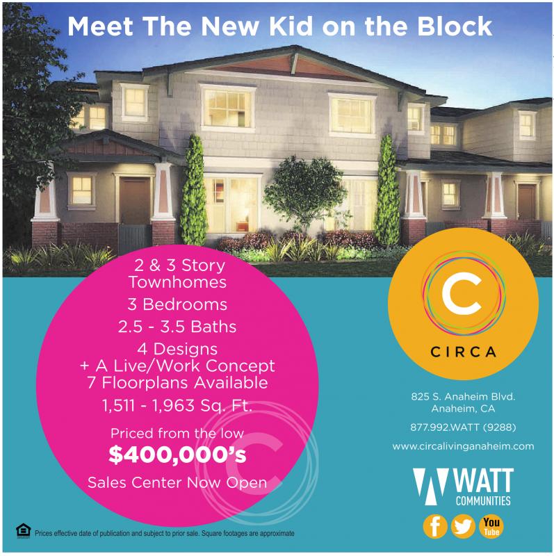 Meet The New Kid on the Block 2 & 3 Story Townhomes 3 Bedrooms 2.5 - 3.5 Baths 4 Designs + A Live/Work Concept 7 Floorplans Available 1,511 - 1,963 Sq. Ft. Priced from the low $400,000’s 825 S. Anaheim Blvd. Anaheim, CA 877.992.WATT (9288) www.circalivinganaheim.com Sales Center Now Open Prices effective date of publication and subject to prior sale. Square footages are approximate