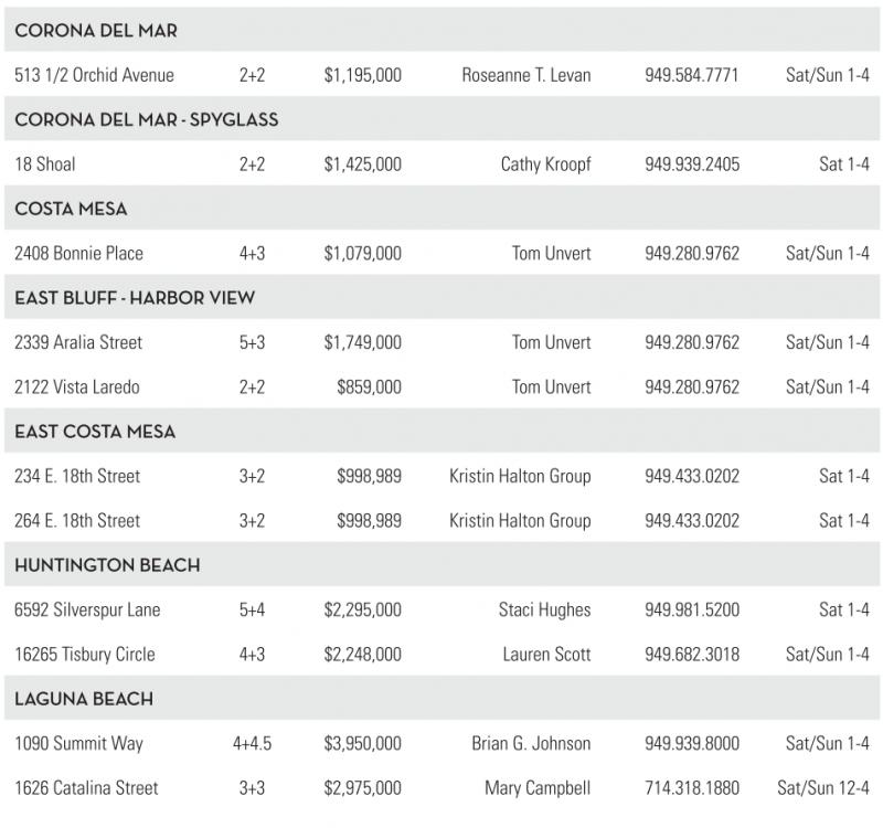 513 1/2 Orchid Avenue 2+2 $1,195,000 Roseanne T. Levan 949.584.7771 Sat/Sun 1-4 CORONA DEL MAR -SPYG SS 18 Shoal 2+2 $1,425,000 Cathy Kroopf 949.939.2405 Sat 1-4 COSTAMESA 2408 Bonnie Place 4+3 $1,079,000 TomUnvert 949.280.9762 Sat/Sun 1-4 EASTBLUFF -HARBOR VIEW 2339 Aralia Street 5+3 $1,749,000 TomUnvert 949.280.9762 Sat/Sun 1-4 2122 Vista Laredo 2+2 $859,000 TomUnvert 949.280.9762 Sat/Sun 1-4 EASTCOSTA MESA 234 E. 18th Street 3+2 $998,989 Kristin Halton Group 949.433.0202 Sat 1-4 264 E. 18th Street 3+2 $998,989 Kristin Halton Group 949.433.0202 Sat 1-4 HUNTINGTONBEACH 6592 Silverspur Lane 5+4 $2,295,000 Staci Hughes 949.981.5200 Sat 1-4 16265 TisburyCircle 4+3 $2,248,000 Lauren Scott 949.682.3018 Sat/Sun 1-4 GUNA BEACH 1090 Summit Way 4+4.5 $3,950,000 Brian G. Johnson 949.939.8000 Sat/Sun 1-4 1626 Catalina Street 3+3 $2,975,000 Mary Campbell 714.318.1880 Sat/Sun 12-4