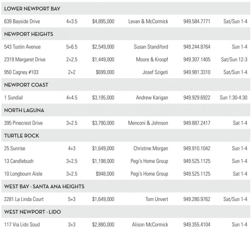 639 Bayside Drive 4+3.5 $4,895,000 Levan &McCormick 949.584.7771 Sat/Sun 1-4 NEWPORTHEIGHTS 543 Tustin Avenue 5+6.5 $2,549,000 Susan Standiford 949.244.8764 Sun 1-4 2319 Margaret Drive 2+2.5 $1,449,000 Moore &Kroopf 949.307.1405 Sat/Sun 12-3 950 Cagney #103 2+2 $699,000 Josef Szigeti 949.981.3310 Sat/Sun 1-4 NEWPORTCOAST 1Sundial 4+4.5 $3,195,000 Andrew Karigan 949.929.6922 Sun 1:30-4:30 NORTH GUNA 395 Pinecrest Drive 3+2.5 $3,790,000 Menconi &Johnson 949.887.2417 Sat 1-4 TURTLE ROCK 25 Sunrise 4+3 $1,649,000 Christine Morgan 949.910.1042 Sun 1-4 13 Candlebush 3+2.5 $1,198,000 Pegi’sHome Group 949.525.1125 Sun 1-4 10 Longbourn Aisle 3+2.5 $948,000 Pegi’sHome Group 949.525.1125 Sat 1-4 WESTBAY -SANTAANA HEIGHTS 2281 La Linda Court 5+3 $1,649,000 TomUnvert 949.280.9762 Sat/Sun 1-4 WESTNEWPORT-LIDO 117 ViaLido Soud 3+3 $2,880,000 Alison McCormick 949.355.4104 Sun 1-4