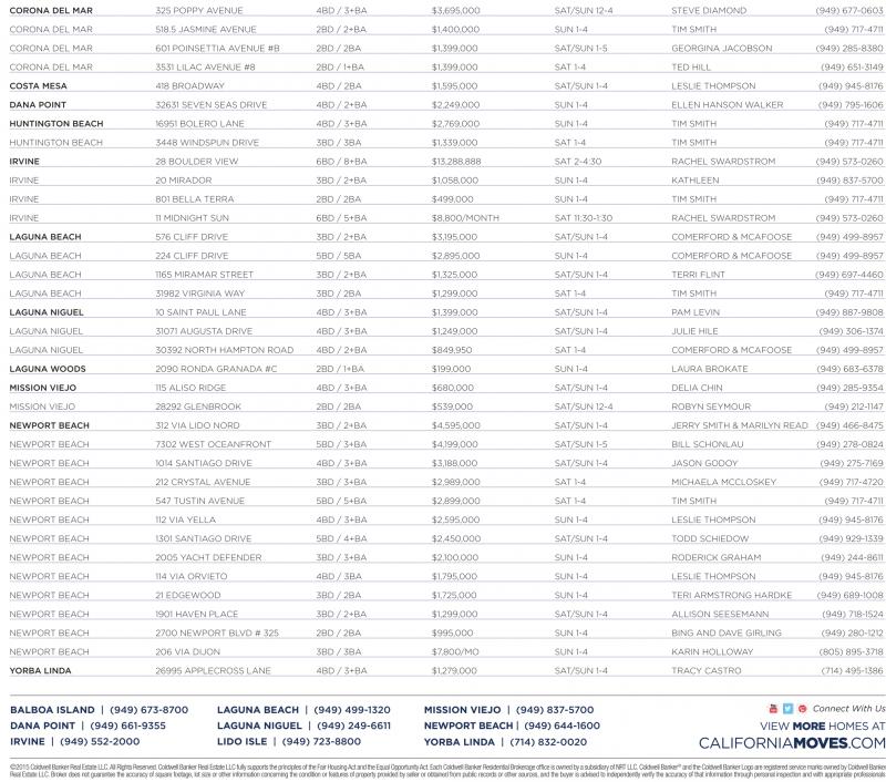 IRVINE 28 BOULDER VIEW 6BD / 8+BA $13,288,888 SAT 2-4:30 RACHEL SWARDSTROM (949) 573-0260 IRVINE 20 MIRADOR 3BD / 2+BA $1,058,000 SUN 1-4 KATHLEEN (949) 837-5700 IRVINE 801 BELLA TERRA 2BD / 2BA $499,000 SUN 1-4 TIM SMITH (949) 717-4711 IRVINE 11 MIDNIGHT SUN 6BD / 5+BA $8,800/MONTH SAT 11:30-1:30 RACHEL SWARDSTROM (949) 573-0260 LAGUNA BEACH 576 CLIFF DRIVE 3BD / 2+BA $3,195,000 SAT/SUN 1-4 COMERFORD & MCAFOOSE (949) 499-8957 LAGUNA BEACH 224 CLIFF DRIVE 5BD / 5BA $2,895,000 SUN 1-4 COMERFORD & MCAFOOSE (949) 499-8957 LAGUNA BEACH 1165 MIRAMAR STREET 3BD / 2+BA $1,325,000 SAT/SUN 1-4 TERRI FLINT (949) 697-4460 LAGUNA BEACH 31982 VIRGINIA WAY 3BD / 2BA $1,299,000 SAT 1-4 TIM SMITH (949) 717-4711 LAGUNA NIGUEL 10 SAINT PAUL LANE 4BD / 3+BA $1,399,000 SAT/SUN 1-4 PAM LEVIN (949) 887-9808 LAGUNA NIGUEL 31071 AUGUSTA DRIVE 4BD / 3+BA $1,249,000 SAT/SUN 1-4 JULIE HILE (949) 306-1374 LAGUNA NIGUEL 30392 NORTH HAMPTON ROAD 4BD / 2+BA $849,950 SAT 1-4 COMERFORD & MCAFOOSE (949) 499-8957 LAGUNA WOODS 2090 RONDA GRANADA #C 2BD / 1+BA $199,000 SUN 1-4 LAURA BROKATE (949) 683-6378 MISSION VIEJO 115 ALISO RIDGE 4BD / 3+BA $680,000 SAT/SUN 1-4 DELIA CHIN (949) 285-9354 MISSION VIEJO 28292 GLENBROOK 2BD / 2BA $539,000 SAT/SUN 12-4 ROBYN SEYMOUR (949) 212-1147 NEWPORT BEACH 312 VIA LIDO NORD 3BD / 2+BA $4,595,000 SAT/SUN 1-4 JERRY SMITH & MARILYN READ (949) 466-8475 NEWPORT BEACH 7302 WEST OCEANFRONT 5BD / 3+BA $4,199,000 SAT/SUN 1-5 BILL SCHONLAU (949) 278-0824 NEWPORT BEACH 1014 SANTIAGO DRIVE 4BD / 3+BA $3,188,000 SAT/SUN 1-4 JASON GODOY (949) 275-7169 NEWPORT BEACH 212 CRYSTAL AVENUE 3BD / 3+BA $2,989,000 SAT 1-4 MICHAELA MCCLOSKEY (949) 717-4720 NEWPORT BEACH 547 TUSTIN AVENUE 5BD / 5+BA $2,899,000 SAT 1-4 TIM SMITH (949) 717-4711 NEWPORT BEACH 112 VIA YELLA 4BD / 3+BA $2,595,000 SUN 1-4 LESLIE THOMPSON (949) 945-8176 NEWPORT BEACH 1301 SANTIAGO DRIVE 5BD / 4+BA $2,450,000 SAT/SUN 1-4 TODD SCHIEDOW (949) 929-1339 NEWPORT BEACH 2005 YACHT DEFENDER 3BD / 3+BA $2,100,000 SUN 1-4 RODERICK GRAHAM (949) 244-8611 NEWPORT BEACH 114 VIA ORVIETO 4BD / 3BA $1,795,000 SUN 1-4 LESLIE THOMPSON (949) 945-8176 NEWPORT BEACH 21 EDGEWOOD 3BD / 2BA $1,725,000 SUN 1-4 TERI ARMSTRONG HARDKE (949) 689-1008 NEWPORT BEACH 1901 HAVEN PLACE 3BD / 2+BA $1,299,000 SAT/SUN 1-4 ALLISON SEESEMANN (949) 718-1524 NEWPORT BEACH 2700 NEWPORT BLVD # 325 2BD / 2BA $995,000 SUN 1-4 BING AND DAVE GIRLING (949) 280-1212 NEWPORT BEACH 206 VIA DIJON 3BD / 3BA $7,800/MO SUN 1-4 KARIN HOLLOWAY (805) 895-3718 YORBA LINDA 26995 APPLECROSS LANE 4BD / 3+BA $1,279,000 SAT/SUN 1-4 TRACY CASTRO (714) 495-1386