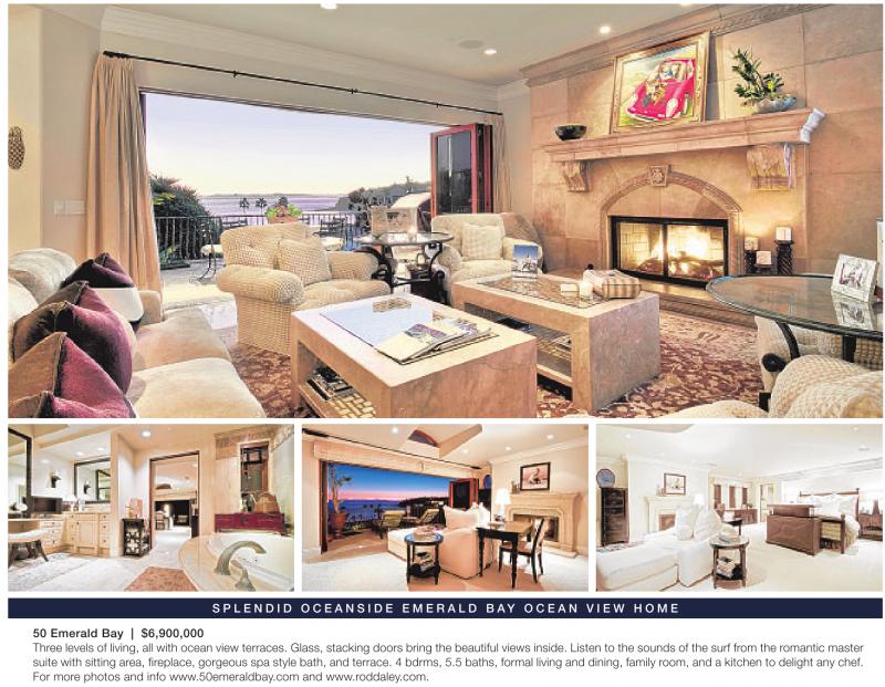 50 Emerald Bay | $6,900,000 Three levels of living, all with ocean view terraces. Glass, stacking doors bring the beautiful views inside. Listen to the sounds of the surf from the romantic master suite with sitting area, fireplace, gorgeous spa style bath, and terrace. 4 bdrms, 5.5 baths, formal living and dining, family room, and a kitchen to delight any chef. For more photos and info www.50emeraldbay.com and www.roddaley.com.