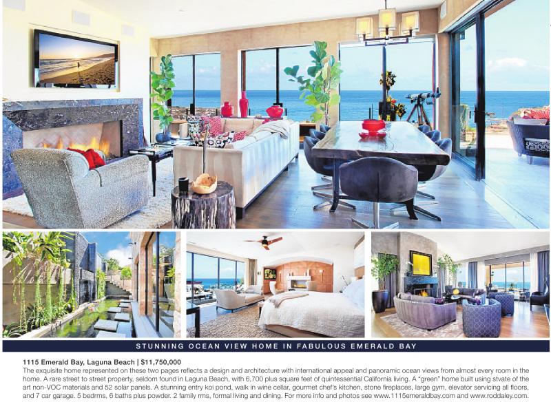 S T U N N I N G O C E A N V I E W H O M E I N FA B U L O U S E M E R A L D B AY 1115 Emerald Bay, Laguna Beach | $11,750,000 The exquisite home represented on these two pages reflects a design and architecture with international appeal and panoramic ocean views from almost every room in the home. A rare street to street property, seldom found in Laguna Beach, with 6,700 plus square feet of quintessential California living. A “green” home built using stvate of the art non-VOC materials and 52 solar panels. A stunning entry koi pond, walk in wine cellar, gourmet chef’s kitchen, stone fireplaces, large gym, elevator servicing all floors, and 7 car garage. 5 bedrms, 6 baths plus powder. 2 family rms, formal living and dining. For more info and photos see www.1115emeraldbay.com and www.roddaley.com.
