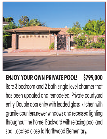 ENJOY YOUR OWN PRIVATE POOL! $799,000 Rare 3bedroom and 2bath single level charmer that has been updated and remodeled. Private courtyard entry. Double door entry with leaded glass ,kitchen with granite counters,newer windows and recessed lighting throughout the home. Backyard with relaxing pool and spa. Located close to Northwood Elementary.