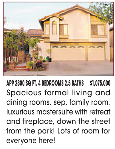 APP 2800 SQFT, 4BEDROOMS 2.5 BATHS $1,075,000 Spacious formal living and dining rooms, sep. family room, luxurious mastersuite with retreat and fireplace, down the street from the park! Lots of room for everyone here!