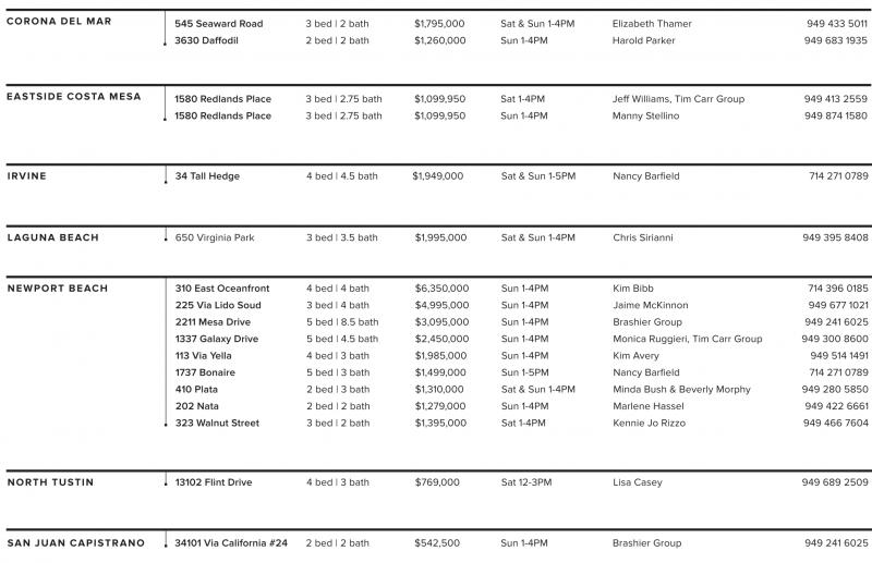 NEWPORT BEACH 310 East Oceanfront 4 bed | 4 bath $6,350,000 Sun 1-4PM Kim Bibb 714 396 0185 225 Via Lido Soud 3 bed | 4 bath $4,995,000 Sun 1-4PM Jaime McKinnon 949 677 1021 2211 Mesa Drive 5 bed | 8.5 bath $3,095,000 Sun 1-4PM Brashier Group 949 241 6025 1337 Galaxy Drive 5 bed | 4.5 bath $2,450,000 Sun 1-4PM Monica Ruggieri, Tim Carr Group 949 300 8600 113 Via Yella 4 bed | 3 bath $1,985,000 Sun 1-4PM Kim Avery 949 514 1491 1737 Bonaire 5 bed | 3 bath $1,499,000 Sun 1-5PM Nancy Barfield 714 271 0789 410 Plata 2 bed | 3 bath $1,310,000 Sat & Sun 1-4PM Minda Bush & Beverly Morphy 949 280 5850 202 Nata 2 bed | 2 bath $1,279,000 Sun 1-4PM Marlene Hassel 949 422 6661 323 Walnut Street 3 bed | 2 bath $1,395,000 Sat 1-4PM Kennie Jo Rizzo 949 466 7604