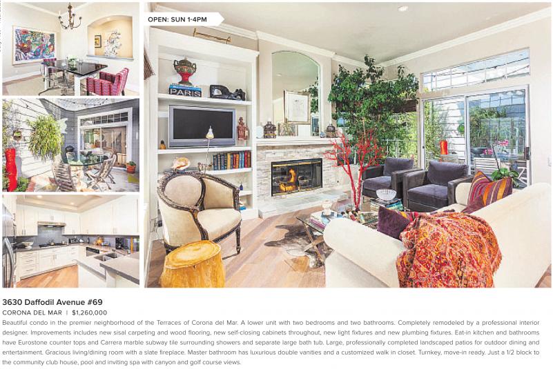 CORONA DEL MAR | $1,260,000 Beautiful condo in the premier neighborhood of the Terraces of Corona del Mar. A lower unit with two bedrooms and two bathrooms. Completely remodeled by a professional interior designer. Improvements includes new sisal carpeting and wood flooring, new self-closing cabinets throughout, new light fixtures and new plumbing fixtures. Eat-in kitchen and bathrooms have Eurostone counter tops and Carrera marble subway tile surrounding showers and separate large bath tub. Large, professionally completed landscaped patios for outdoor dining and entertainment. Gracious living/dining room with a slate fireplace. Master bathroom has luxurious double vanities and a customized walk in closet. Turnkey, move-in ready. Just a 1/2 block to the community club house, pool and inviting spa with canyon and golf course views.