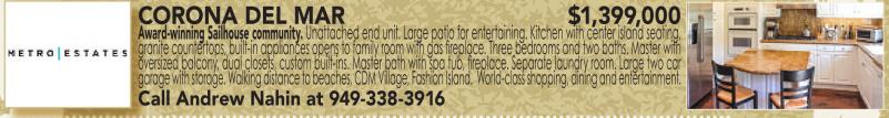 CORONA DEL MAR $1,399,000 Award-winning Sailhouse community. Unattached end unit. Large patio for entertaining. Kitchen with center island seating, granite countertops, built-in appliances opens tofamily room with gas fireplace. Three bedrooms and two baths. Master with oversized balcony, dual closets, custom built-ins. Master bath with spa tub, fireplace. Separate laundry room. Large two car garage with storage. Walkingdistancetobeaches, CDMVillage, FashionIsland. World-classshopping, dining andentertainment. Call Andrew Nahin at 949-338-3916