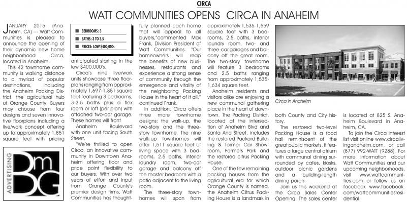 2015 (Anaheim, CA) --- Watt Communities is pleased to announce the opening of their dynamic new home neighborhood Circa, located in Anaheim.