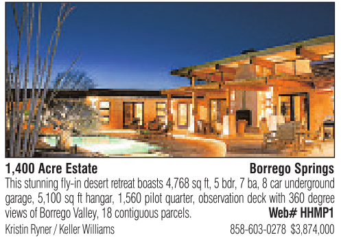 Thisstunning fly-in desertretreat boasts4,768sqft, 5bdr,7ba, 8car underground garage, 5,100 sqfthangar, 1,560 pilot quarter, observation deck with 360 degree views of Borrego Valley,18contiguous parcels. Web# HHMP1