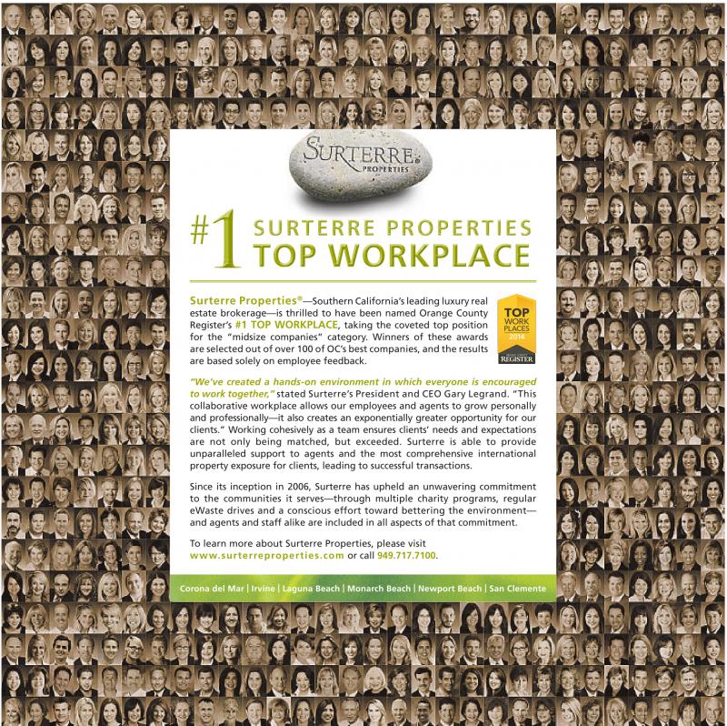 S U R T E R R E P R O P E R T I E S Surterre Properties ® —Southern California’sleading luxury real estate brokerage—is thrilled to have been named Orange County Register’s #1 TOP WORKPLACE, taking the coveted top position for the “midsize companies” category. Winners of these awards are selected out of over 100 of OC’s best companies, and the results are based solely on employee feedback. “We’ve created a hands-on environment in which everyone is encouraged to work together,” stated Surterre’s President and CEO Gary Legrand. “This collaborative workplace allows our employees and agents to grow personally and professionally—it also creates an exponentially greater opportunity for our clients.” Working cohesively as a team ensures clients’ needs and expectations are not only being matched, but exceeded. Surterre is able to provide unparalleled support to agents and the most comprehensive international property exposure for clients, leading to successful transactions. Since its inception in 2006, Surterre has upheld an unwavering commitment to the communities it serves—through multiple charity programs, regular eWaste drives and a conscious effort toward bettering the environment— and agents and staff alike are included in all aspects of that commitment. To learn more about Surterre Properties, please visit www.surterreproperties.com or call 949.717.7100. Corona del Mar | Irvine | Laguna Beach | Monarch Beach | Newport Beach | San Clemente