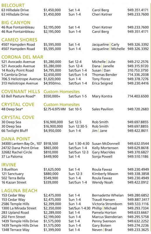 BELCOURT 63 HillsdaleDrive $1,450,000 Sat 1-4 CarolBerg 949.351.4171 63 HillsdaleDrive $1,450,000 Sun 1-4 Cheri Ketner 949.233.7600 BIG CANYON 46 RueFontainbleau $2,195,000 Sat 1-4 CheriKetner 949.233.7600 46 RueFontainbleau $2,195,000 Sun 1-4 Carol Berg 949.351.4171 CAMEO SHORES 4507 Hampden Road $5,595,000 Sat 1-4 Jacqueline | Carly 949.326.3392 4507 Hampden Road $5,595,000 Sun 1-4 Jacqueline | Michelle 949.326.3392 CORONA DEL MAR 521Avocado Avenue $5,280,000 Sat 12-4 Michelle | Julie 949.212.2576 521Avocado Avenue $5,280,000 Sun 12-4 Dana | Janelle 949.315.9720 14 RockyPoint Road $4,795,000 Sat/Sun 1-4 Susan | Dan 310.753.3750 5Cambria Drive $2,650,000 Sat/Sun 1-4 Thomas Bender 714.336.2038 706.5HeliotropeAvenue $1,020,000 Sun 1-4 TonyFlorez 949.378.7276 313HeliotropeAvenue $4,950/mo. Sat/Sun 1-4 Erica Seigred 949.230.4416 COVENANT HILLS Custom Homesites 63 BellPasture Road* $550,000+ Sat/Sun 1-5 MaryKontra 714.403.6500