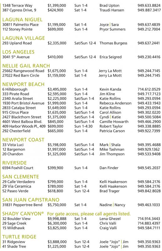 LAGUNA NIGUEL 30811PalmettoPlace $1,199,000 Sat 1-4 Joyce | Sara 949.637.4839 112StoneyPointe $699,000 Sun 1-4 Pryor Summers 949.212.7004 LAGUNA VILLAGE 293UplandRoad $2,335,000 Sat/Sun 12-4 Thomas Burgess 949.637.2441 LOS ANGELES 3041 5 th Avenue $410,000 Sat/Sun 12-4 Erica Seigred 949.230.4416 NELLIE GAIL RANCH 25662Rangewood Road $1,675,000 Sun 1-4 Jerry La Mott 949.244.7145 27022 RedBarn Circle $1,159,000 Sat 1-4 JerryLaMott 949.244.7145 NEWPORT BEACH 6Hillsborough $3,495,000 Sun 1-4 Kevin Kanda 714.612.0529 333 PirateRoad $2,595,000 Sun 1-4 Jim Kline 949.717.7123 2340 Aralia Street $2,225,000 Sat/Sun 1-4 Katie Rollins 949.293.0594 1930 Port BristolAvenue $1,999,000 Sun 1-4 Rebecca Anderson 949.433.1943 2833 CatalpaStreet $1,649,000 Sun 1-4 Katie Rollins 949.293.0594 915Citrus Place $1,635,000 Sat/Sun 1-4 Carol Allison 949.302.0220 2427 BlackthornStreet $1,375,000 Sat/Sun 1-4 Cyndi | Katie 949.500.5084 4601 West Balboa Blvd. $845,000 Sat/Sun 1-4 Camille Howarth 949.466.2900 409HarborWoods Pl.,409 $699,000 Sun 1-4:30 RobertTaylor 949.338.8885 292Chesterfield $665,000 Sun 1-4 PatriciaCarson 949.922.7399 NEWPORT COAST 33 VistaLuci $5,198,000 Sat/Sun 1-4 Mark | Shala 949.395.4688 12 Bargemon $1,997,000 Sat/Sun 1-4 MikeTashman 949.929.1362 20 Chandon $1,325,000 Sat/Sun 1-4 Jim Thompson 949.533.9408 RIVERSIDE 6594 FoxhillCourt $399,900 Sun 1-4 Dan Finder 949.545.2037 SAN CLEMENTE 29 CalleVerdadero $799,000 Sun 1-4 Kelli Haakenson 949.584.2176 29 Via Ceramica $789,000 Sat 1-4 Kelli Haakenson 949.584.2176 52 PaseoVerde $618,800 Sun 12-4 Brad Trager 949.842.8028 SAN JUAN CAPISTRANO 31831PeppertreeBend $5,750,000 Sat 1-4 Nadine | Nancy 949.463.1033 SHADY CANYON ® For gate access, please call agents listed. 32 Boulder View $9,998,888 Sat 1-4 Lena Ghezel 714.914.3443 29 Sage Creek $6,300,000 Sun 1-4 Chris Valli 714.883.4397 15 Wildhawk $3,825,000 Sun 1-4 Craig Valli 949.584.7111 TURTLE RIDGE 31 Ridgeview $3,888,000 Sun 12-4 Joele “Jojo” | Jim 949.350.9363 41 ShadeTree $1,225,000 Sun 12-4 Joele “Jojo” | Jim 949.350.9363
