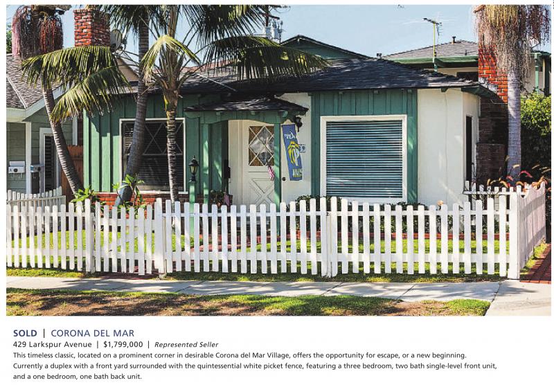 429 Larkspur Avenue | $1,799,000 | Represented Seller This timeless classic, located on a prominent corner in desirable Corona del Mar Village, offers the opportunity for escape, or a new beginning. Currently a duplex with a front yard surrounded with the quintessential white picket fence, featuring a three bedroom, two bath single-level front unit, and a one bedroom, one bath back unit.