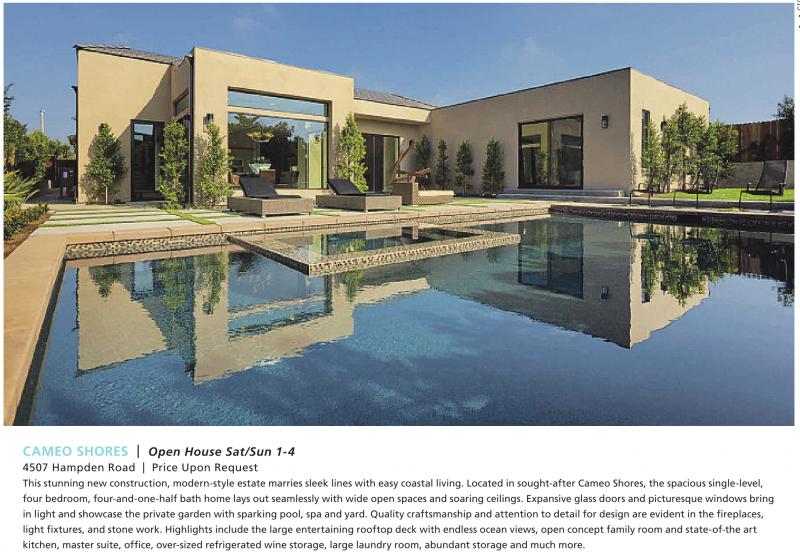 This stunning new construction, modern-style estate marries sleek lines with easy coastal living. Located in sought-after Cameo Shores, the spacious single-level, four bedroom, four-and-one-half bath home lays out seamlessly with wide open spaces and soaring ceilings. Expansive glass doors and picturesque windows bring in light and showcase the private garden with sparking pool, spa and yard. Quality craftsmanship and attention to detail for design are evident in the fireplaces, light fixtures, and stone work. Highlights include the large entertaining rooftop deck with endless ocean views, open concept family room and state-of-the art kitchen, master suite, office, over-sized refrigerated wine storage, large laundry room, abundant storage and much more.