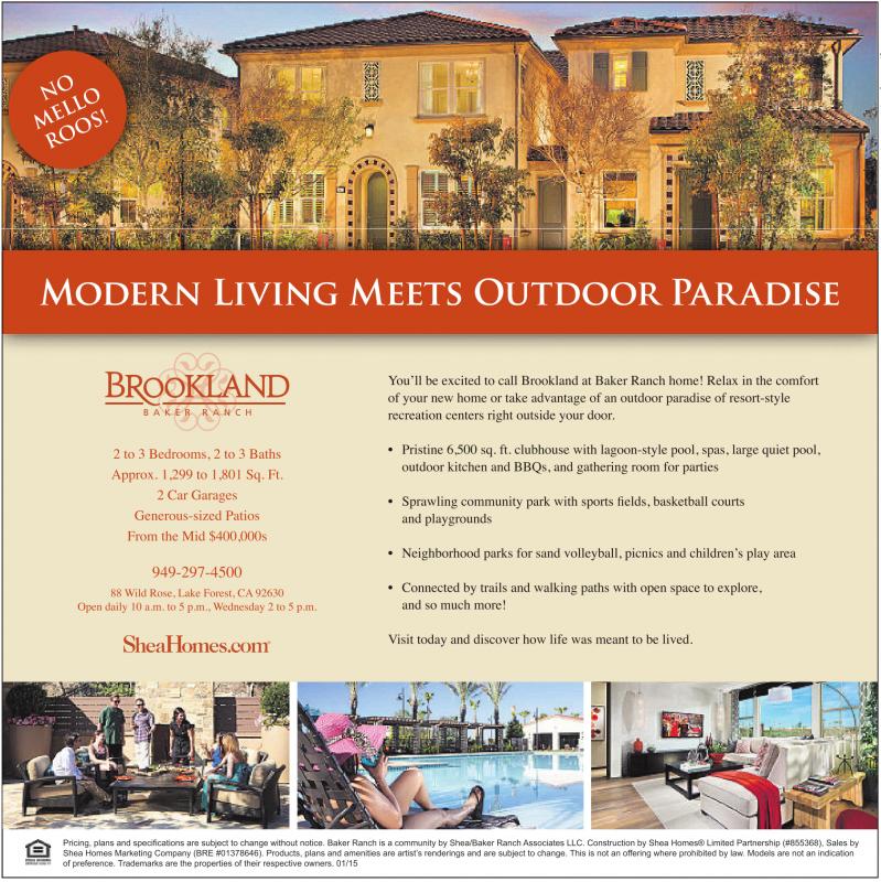 Pricing, plans and specifications are subject to change without notice. Baker Ranch is acommunity by Shea/Baker Ranch Associates LLC. Construction by Shea Homes® Limited Partnership (#855368), Sales by Shea Homes Marketing Company (BRE #01378646). Products, plans and amenities are artist’s renderings and are subject to change. This is not an offering where prohibited by law. Models are not an indication of preference. Trademarks are the properties of their respective owners. 01/15
