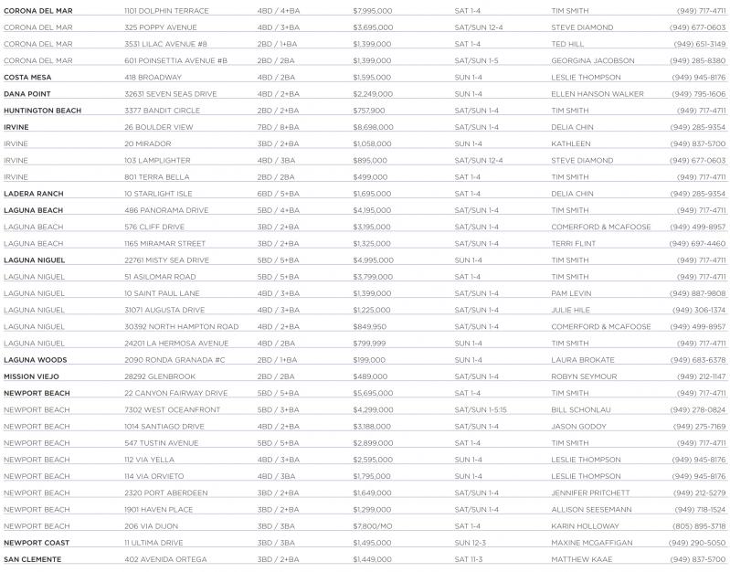 CORONA DEL MAR 601 POINSETTIA AVENUE #B 2BD / 2BA $1,399,000 SAT/SUN 1-5 GEORGINA JACOBSON (949) 285-8380 COSTA MESA 418 BROADWAY 4BD / 2BA $1,595,000 SUN 1-4 LESLIE THOMPSON (949) 945-8176 DANA POINT 32631 SEVEN SEAS DRIVE 4BD / 2+BA $2,249,000 SUN 1-4 ELLEN HANSON WALKER (949) 795-1606 HUNTINGTON BEACH 3377 BANDIT CIRCLE 2BD / 2+BA $757,900 SAT/SUN 1-4 TIM SMITH (949) 717-4711 IRVINE 26 BOULDER VIEW 7BD / 8+BA $8,698,000 SAT/SUN 1-4 DELIA CHIN (949) 285-9354 IRVINE 20 MIRADOR 3BD / 2+BA $1,058,000 SUN 1-4 KATHLEEN (949) 837-5700 IRVINE 103 LAMPLIGHTER 4BD / 3BA $895,000 SAT/SUN 12-4 STEVE DIAMOND (949) 677-0603 IRVINE 801 TERRA BELLA 2BD / 2BA $499,000 SAT 1-4 TIM SMITH (949) 717-4711 LADERA RANCH 10 STARLIGHT ISLE 6BD / 5+BA $1,695,000 SAT 1-4 DELIA CHIN (949) 285-9354 LAGUNA BEACH 486 PANORAMA DRIVE 5BD / 4+BA $4,195,000 SAT/SUN 1-4 TIM SMITH (949) 717-4711 LAGUNA BEACH 576 CLIFF DRIVE 3BD / 2+BA $3,195,000 SAT/SUN 1-4 COMERFORD & MCAFOOSE (949) 499-8957 LAGUNA BEACH 1165 MIRAMAR STREET 3BD / 2+BA $1,325,000 SAT/SUN 1-4 TERRI FLINT (949) 697-4460 LAGUNA NIGUEL 22761 MISTY SEA DRIVE 5BD / 5+BA $4,995,000 SUN 1-4 TIM SMITH (949) 717-4711 LAGUNA NIGUEL 51 ASILOMAR ROAD 5BD / 5+BA $3,799,000 SAT 1-4 TIM SMITH (949) 717-4711 LAGUNA NIGUEL 10 SAINT PAUL LANE 4BD / 3+BA $1,399,000 SAT/SUN 1-4 PAM LEVIN (949) 887-9808 LAGUNA NIGUEL 31071 AUGUSTA DRIVE 4BD / 3+BA $1,225,000 SAT/SUN 1-4 JULIE HILE (949) 306-1374 LAGUNA NIGUEL 30392 NORTH HAMPTON ROAD 4BD / 2+BA $849,950 SAT/SUN 1-4 COMERFORD & MCAFOOSE (949) 499-8957 LAGUNA NIGUEL 24201 LA HERMOSA AVENUE 4BD / 2BA $799,999 SUN 1-4 TIM SMITH (949) 717-4711 LAGUNA WOODS 2090 RONDA GRANADA #C 2BD / 1+BA $199,000 SUN 1-4 LAURA BROKATE (949) 683-6378 MISSION VIEJO 28292 GLENBROOK 2BD / 2BA $489,000 SAT/SUN 1-4 ROBYN SEYMOUR (949) 212-1147 NEWPORT BEACH 22 CANYON FAIRWAY DRIVE 5BD / 5+BA $5,695,000 SAT 1-4 TIM SMITH (949) 717-4711 NEWPORT BEACH 7302 WEST OCEANFRONT 5BD / 3+BA $4,299,000 SAT/SUN 1-5:15 BILL SCHONLAU (949) 278-0824 NEWPORT BEACH 1014 SANTIAGO DRIVE 4BD / 2+BA $3,188,000 SAT/SUN 1-4 JASON GODOY (949) 275-7169 NEWPORT BEACH 547 TUSTIN AVENUE 5BD / 5+BA $2,899,000 SAT 1-4 TIM SMITH (949) 717-4711 NEWPORT BEACH 112 VIA YELLA 4BD / 3+BA $2,595,000 SUN 1-4 LESLIE THOMPSON (949) 945-8176 NEWPORT BEACH 114 VIA ORVIETO 4BD / 3BA $1,795,000 SUN 1-4 LESLIE THOMPSON (949) 945-8176 NEWPORT BEACH 2320 PORT ABERDEEN 3BD / 2+BA $1,649,000 SAT/SUN 1-4 JENNIFER PRITCHETT (949) 212-5279 NEWPORT BEACH 1901 HAVEN PLACE 3BD / 2+BA $1,299,000 SAT/SUN 1-4 ALLISON SEESEMANN (949) 718-1524 NEWPORT BEACH 206 VIA DIJON 3BD / 3BA $7,800/MO SAT 1-4 KARIN HOLLOWAY (805) 895-3718 NEWPORT COAST 11 ULTIMA DRIVE 3BD / 3BA $1,495,000 SUN 12-3 MAXINE MCGAFFIGAN (949) 290-5050 SAN CLEMENTE 402 AVENIDA ORTEGA 3BD / 2+BA $1,449,000 SAT 11-3 MATTHEW KAAE (949) 837-5700