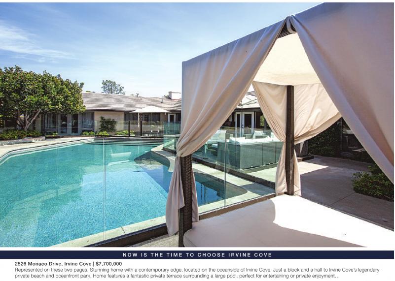 N O W I S T H E T I M E T O C H O O S E I R V I N E C O V E 2526 Monaco Drive, Irvine Cove | $7,700,000 Represented on these two pages. Stunning home with a contemporary edge, located on the oceanside of Irvine Cove. Just a block and a half to Irvine Cove’s legendary private beach and oceanfront park. Home features a fantastic private terrace surrounding a large pool, perfect for entertaining or private enjoyment…