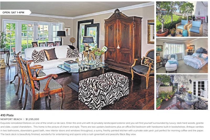 OPEN: SAT 1-4PM 410 Plata NEWPORT BEACH | $1,295,000 Exquisite remodeled Delores on one of the small cul de sacs. Enter this end unit with its privately landscaped exterior and you will find yourself surrounded by luxury: dark hard woods, granite and slate, crystal chandeliers . This home is the picture of charm and style. There are two upstairs bedrooms plus an office/3rd bedroom with handsome built-in bookshelves. Antique vanities in two bathrooms, downstairs guest bath, new interior doors and windows throughout, a sunny, freshly painted kitchen with a private side yard- just perfect for morning coffee and the paper. The back deck is beautifully finished, wonderful for entertaining and opens onto a lush greenbelt and peaceful Back Bay view.