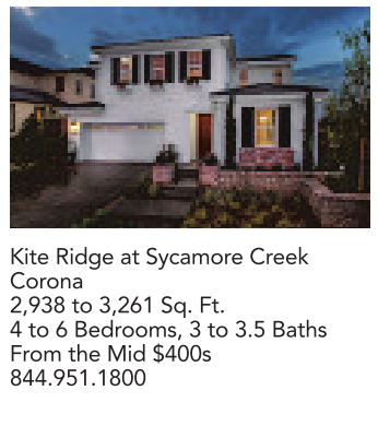Kite Ridge at Sycamore Creek Corona 2,938 to 3,261 Sq. Ft. 4to6Bedrooms, 3to3.5 Baths From the Mid $400s 844.951.1800