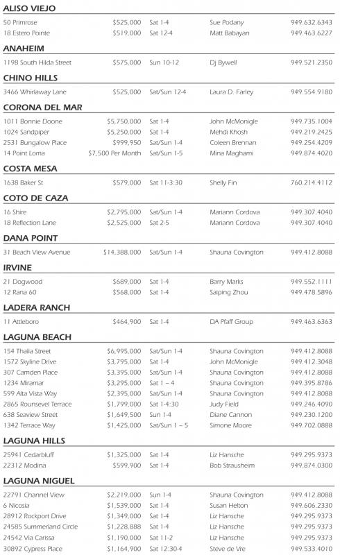 50 Primrose $525,000 Sat 1-4 Sue Podany 949.632.6343 18 Estero Pointe $519,000 Sat 12-4 Matt Babayan 949.463.6227 AnAheim 1198 South Hilda Street $575,000 Sun 10-12 Dj Bywell 949.521.2350 Chino hills 3466 Whirlaway Lane $525,000 Sat/Sun 12-4 Laura D. Farley 949.554.9180 CoronA del mAr 1011 Bonnie Doone $5,750,000 Sat 1-4 John McMonigle 949.735.1004 1024 Sandpiper $5,250,000 Sat 1-4 Mehdi Khosh 949.219.2425 2531 Bungalow Place $999,950 Sat/Sun 1-4 Coleen Brennan 949.254.4209 14 Point Loma $7,500 Per Month Sat/Sun 1-5 Mina Maghami 949.874.4020 CostA mesA 1638 Baker St $579,000 Sat 11-3:30 Shelly Fin 760.214.4112 Coto de CAzA 16 Shire $2,795,000 Sat/Sun 1-4 Mariann Cordova 949.307.4040 18 Reflection Lane $2,525,000 Sat 2-5 Mariann Cordova 949.307.4040 dAnA Point 31 Beach View Avenue $14,388,000 Sat/Sun 1-4 Shauna Covington 949.412.8088 irVine 21 Dogwood $689,000 Sat 1-4 Barry Marks 949.552.1111 12 Rana 60 $568,000 Sat 1-4 Saiping Zhou 949.478.5896 lAderA rAnCh 11 Attleboro $464,900 Sat 1-4 DA Pfaff Group 949.463.6363 lAgunA BeACh 154 Thalia Street $6,995,000 Sat/Sun 1-4 Shauna Covington 949.412.8088 1572 Skyline Drive $3,795,000 Sat 1-4 John McMonigle 949.412.3048 307 Camden Place $3,395,000 Sat/Sun 1-4 Shauna Covington 949.412.8088 1234 Miramar $3,295,000 Sat 1–4 Shauna Covington 949.395.8786 599 Alta Vista Way $2,395,000 Sat/Sun 1-4 Shauna Covington 949.412.8088 2865 Rounsevel Terrace $1,799,000 Sat 1-4:30 Judy Field 949.246.4090 638 Seaview Street $1,649,500 Sun 1-4 Diane Cannon 949.230.1200 1342 Terrace Way $1,425,000 Sat/Sun 1–5 Simone Moore 949.702.0888 lAgunA hills 25941 Cedarbluff $1,325,000 Sat 1-4 Liz Hansche 949.295.9373 22312 Modina $599,900 Sat 1-4 Bob Strausheim 949.874.0300 lAgunA niguel 22791 Channel View $2,219,000 Sun 1-4 Shauna Covington 949.412.8088 6Nicosia $1,539,000 Sat 1-4 Susan Helton 949.606.2330 28912 Rockport Drive $1,349,000 Sat 1-4 Liz Hansche 949.295.9373 24585 Summerland Circle $1,228,888 Sat 1-4 Liz Hansche 949.295.9373 24542 Via Carissa $1,190,000 Sat 11-2 Liz Hansche 949.295.9373 30892 Cypress Place $1,164,900 Sat 12:30-4 Steve de Vre 949.533.4010
