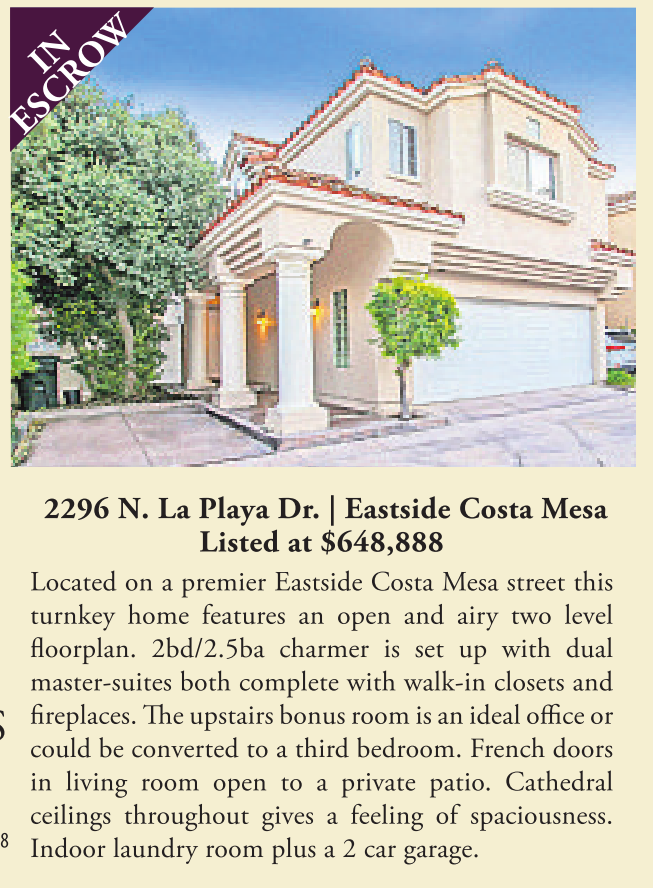 PROPERTIES 01941608 2296 N. La Playa Dr. | Eastside Costa Mesa Listed at $648,888 Located on a premier Eastside Costa Mesa street this turnkey home features an open and airy two level floorplan. 2bd/2.5ba charmer is set up with dual master-suites both complete with walk-in closets and fireplaces. The upstairs bonus room is an ideal office or could be converted to a third bedroom. French doors in living room open to a private patio. Cathedral ceilings throughout gives a feeling of spaciousness. Indoor laundry room plus a 2 car garage.
