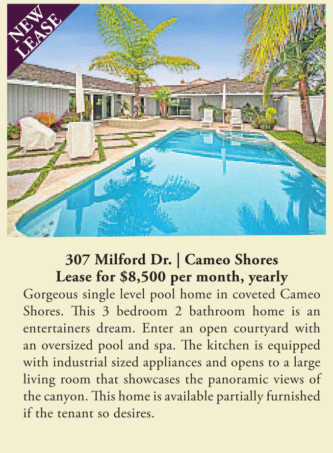 307 Milford Dr. | Cameo Shores Lease for $8,500 per month, yearly Gorgeous single level pool home in coveted Cameo Shores. This 3 bedroom 2 bathroom home is an entertainers dream. Enter an open courtyard with an oversized pool and spa. The kitchen is equipped with industrial sized appliances and opens to a large living room that showcases the panoramic views of the canyon. This home is available partially furnished if the tenant so desires.