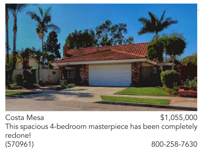 Costa Mesa $1,055,000 This spacious 4-bedroom masterpiece has been completely redone! (570961) 800-258-7630