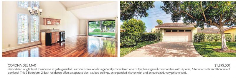 CORONA DEL MAR $1,295,000 Remodeled single level townhome in gate-guarded Jasmine Creek which is generally considered one of the finest gated communities with 3 pools, 6 tennis courts and 82 acres of parkland. This 2 Bedroom, 2 Bath residence offers a separate den, vaulted ceilings, an expanded kitchen with and an oversized, very private yard.