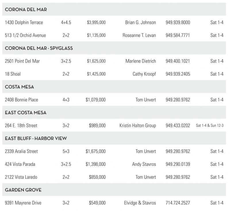 CORONA DEL MAR 1430 Dolphin Terrace 4+4.5 $3,995,000 Brian G. Johnson 949.939.8000 Sat 1-4 513 1/2 Orchid Avenue 2+2 $1,135,000 Roseanne T. Levan 949.584.7771 Sat 1-4 CORONA DEL MAR -SPYG SS 2501 Point Del Mar 3+2.5 $1,625,000 Marlene Dietrich 949.400.1021 Sat 1-4 18 Shoal 2+2 $1,425,000 Cathy Kroopf 949.939.2405 Sat 1-4 COSTAMESA 2408 Bonnie Place 4+3 $1,079,000 TomUnvert 949.280.9762 Sat 1-4 EASTCOSTA MESA 264 E. 18th Street 3+2 $989,000 Kristin Halton Group 949.433.0202 Sat 1-4 &Sun 12-3 EASTBLUFF -HARBOR VIEW 2339 Aralia Street 5+3 $1,675,000 TomUnvert 949.280.9762 Sat 1-4 424 VistaParada 3+2.5 $1,398,000 Andy Stavros 949.290.0139 Sat 1-4 2122 VistaLaredo 2+2 $859,000 TomUnvert 949.280.9762 Sat 1-4 GARDEN GROVE 9391 Mayrene Drive 3+2 $549,000 Elvidge &Stavros 714.724.2527 Sat 1-4