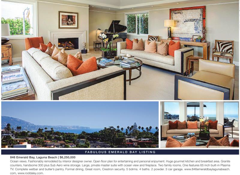 846 Emerald Bay, Laguna Beach | $6,250,000 Ocean views. Fashionably remodeled by interior designer owner. Open floor plan for entertaining and personal enjoyment. Huge gourmet kitchen and breakfast area. Granite counters, handsome 300 plus Sub Aero wine storage. Large, private master suite with ocean view and fireplace. Two family rooms. One features 65 inch built-in Plasma TV. Complete wetbar and butler’s pantry. Formal dining, Great room, Crestron security. 5 bdrms. 4 baths. 2 powder. 3 car garage. www.846emeraldbaylagunabeach. com, www.roddaley.com. FA B U L O U S E M E R A L D B AY L I S T I N G