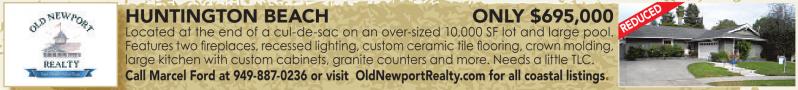 HUNTINGTON BEACH ONLY $695,000 Located at the end of a cul-de-sac on an over-sized 10,000 SF lot and large pool. Features two fireplaces, recessed lighting, custom ceramic tile flooring, crown molding, large kitchen with custom cabinets, granite counters and more. Needs a little TLC. Call Marcel Ford at 949-887-0236 or visit OldNewportRealty.com for all coastal listings.