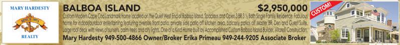 MARYHARDESTY REALTY BALBOA ISLAND $2,950,000 Custom Modern Cape CodLandmark Home locatedonthe QuietWestEnd of Balboa Island. Spaciousand Open 3BR3½BathSingleFamilyResidence.Fabulous home for indoor/outdoor entertaining featuring oversize front patio, private side patio off kitchen area, balcony patios off Master BR, Den and Guest Suite. Largeroofdeckwithviews of sunsets,palm treesand citylights. OneofaKindHomebuilt by AccomplishedCustomBalboa Island Builder,Vitarelli Construction. Mary Hardesty 949-500-4866 Owner/Broker Erika Primeau 949-244-9205 Associate Broker