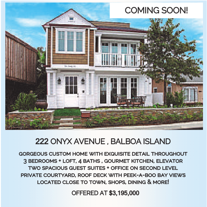 COMING SOON! 222 ONYX AVENUE , BALBOA ISLAND gorgeous custom home with exquisite detail throughout 3 bedrooms + loft, 4 baths , gourmet kitchen, elevator two spacious guest suites + office on second level private courtyard, roof deck with peek-a-boo bay views located close to town, shops, dining & more! OFFERED AT $3,195,000