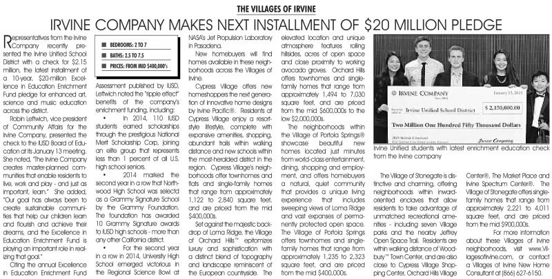 from the Irvine Company recently presented the Irvine Unified School District with a check for $2.15 million, the latest installment of a 10-year, $20-million Excellence in Education Enrichment Fund pledge for enhanced art, science and music education acrossthe district.