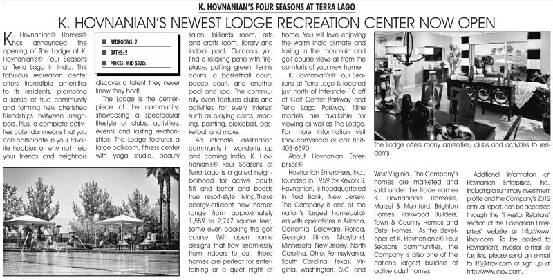 The Lodge offers many amenities, clubs and activities to residents West Virginia. The Company’s homes are marketed and sold under the trade names K. Hovnanian® Homes®, Matzel & Mumford, Brighton Homes, Parkwood Builders, Town & Country Homes and Oster Homes. As the developer of K. Hovnanian’s® Four Seasons communities, the Company is also one of the nation’s largest builders of active adult homes.