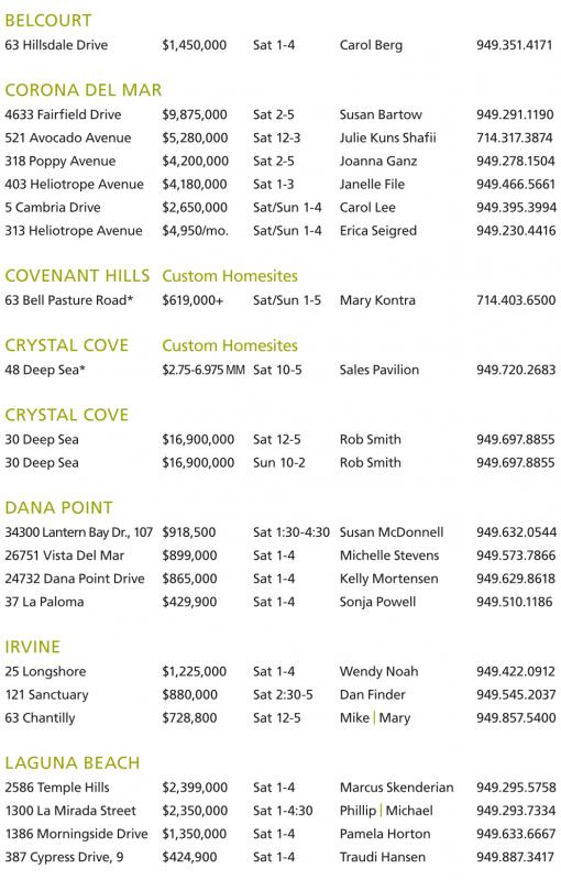 2586 Temple Hills $2,399,000 Sat 1-4 Marcus Skenderian 949.295.5758 1300 La Mirada Street $2,350,000 Sat 1-4:30 Phillip | Michael 949.293.7334 1386 MorningsideDrive $1,350,000 Sat 1-4 Pamela Horton 949.633.6667 387Cypress Drive, 9 $424,900 Sat 1-4 TraudiHansen 949.887.3417