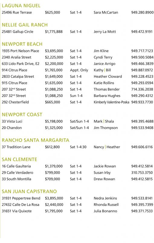 1935 Port NelsonPlace $3,695,000 Sat 1-4 JimKline 949.717.7123 2340 Aralia Street $2,225,000 Sat 1-4 CyndiTerry 949.500.5084 633LidoPark Drive, E2 $2,200,000 Sat 1-4 Janice Arrigo 949.466.3839 914CitrusPlace $1,765,000 Appt.Only Kathy | Bill 949.887.0972 2833 CatalpaStreet $1,649,000 Sat 1-4 HeatherCloward 949.228.4523 915CitrusPlace $1,635,000 Sat 1-4 KatieRollins 949.293.0594 20732 nd Street $1,088,250 Sat 1-4 Thomas Bender 714.336.2038 20732 nd Street $1,088,250 Sun 1-4 BarbaraHughes 949.290.4312 292Chesterfield $665,000 Sat 1-4 Kimberly Valentine-Poska 949.933.7730