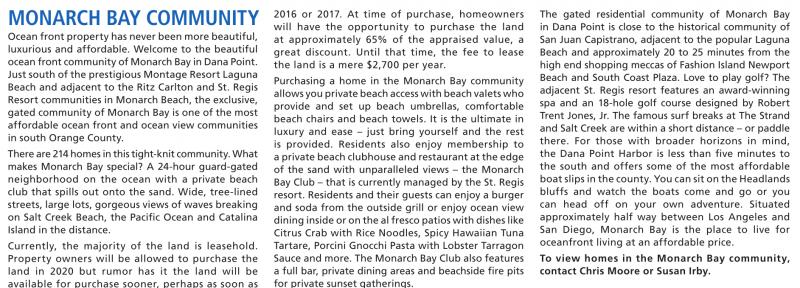 MONARCH BAY COMMUNITY Oceanfront property has neverbeenmorebeautiful, luxurious and affordable. Welcome to the beautiful ocean frontcommunityofMonarch Bay in Dana Point. Just south of the prestigious Montage Resort Laguna Beach and adjacent to the Ritz Carlton and St. Regis Resort communities in Monarch Beach, the exclusive, gated community of Monarch Bay is one of the most affordable ocean front and ocean view communities in south Orange County. Thereare 214homes in this tight-knit community. What makes Monarch Bay special? A 24-hour guard-gated neighborhood on the ocean with a private beach club that spills out onto the sand. Wide, tree-lined streets, large lots, gorgeous views of waves breaking on Salt Creek Beach, the Pacific Ocean and Catalina Island in the distance. Currently, the majority of the land is leasehold. Property owners will be allowed to purchase the land in 2020 but rumor has it the land will be available for purchase sooner, perhaps as soon as 2016 or 2017. At time of purchase, homeowners will have the opportunity to purchase the land at approximately 65% of the appraised value, a great discount. Until that time, the fee to lease the land is a mere $2,700 per year. Purchasing a home in the Monarch Bay community allows youprivate beachaccesswithbeachvaletswho provide and set up beach umbrellas, comfortable beach chairs and beach towels. It is the ultimate in luxury and ease – just bring yourself and the rest is provided. Residents also enjoy membership to aprivate beachclubhouse andrestaurant at theedge of the sand with unparalleled views – the Monarch Bay Club – that is currently managed by the St. Regis resort. Residents and their guests can enjoy a burger and soda from the outside grill or enjoy ocean view dininginsideoronthe al frescopatioswithdisheslike Citrus Crab with Rice Noodles, Spicy Hawaiian Tuna Tartare, Porcini Gnocchi Pasta with Lobster Tarragon Sauce and more. The Monarch Bay Club also features a full bar, private dining areas and beachside fire pits for private sunset gatherings. The gated residential community of Monarch Bay in Dana Point is close to the historical community of San Juan Capistrano, adjacent to the popular Laguna Beach and approximately 20 to 25 minutes from the high end shopping meccas of Fashion Island Newport Beach and South Coast Plaza. Love to play golf? The adjacent St. Regis resort features an award-winning spa and an 18-hole golf course designed by Robert Trent Jones, Jr. The famous surf breaks at The Strand and Salt Creek are within a short distance – or paddle there. For those with broader horizons in mind, the Dana Point Harbor is less than five minutes to the south and offers some of the most affordable boat slipsinthe county.You cansit on theHeadlands bluffs and watch the boats come and go or you can head off on your own adventure. Situated approximately half way between Los Angeles and San Diego, Monarch Bay is the place to live for oceanfront living at an affordable price. To view homes in the Monarch Bay community, contact Chris Moore or Susan Irby.