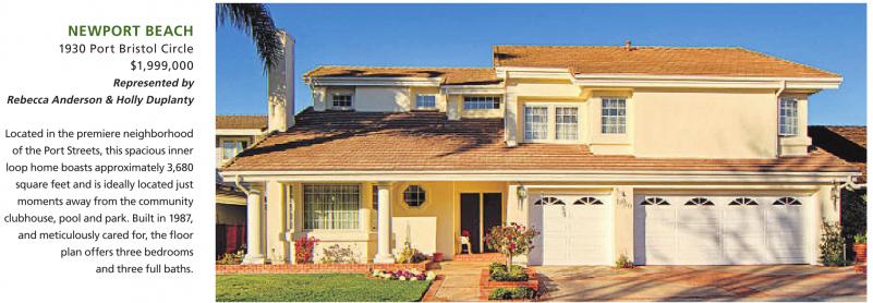 NEWPORT BEACH 1930 Port Bristol Circle $1,999,000 Represented by Rebecca Anderson & Holly Duplanty Locatedinthe premiere neighborhood of thePortStreets, thisspaciousinner loop home boasts approximately3,680 squarefeet andisideallylocatedjust moments away from thecommunity clubhouse,pooland park. Builtin1987, andmeticulously caredfor,the floor plan offers threebedrooms andthreefullbaths. See also