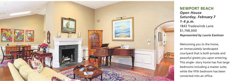 NEWPORT BEACH Open House Saturday, February 7 1-4 p.m. 1843 Tradewinds Lane $1,748,000 Represented by Laurie Eastman Welcoming you to the home, an immaculately landscaped courtyard that is both private and peaceful greets you upon entering. This single- story home has five large bedrooms including a master suite, while the fifth bedroom has been converted into an office. See also