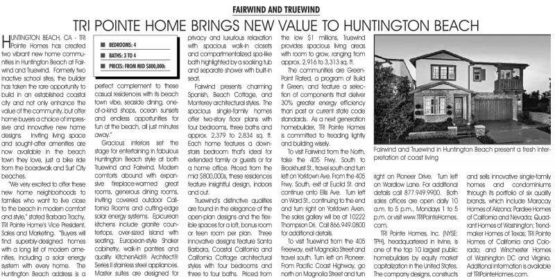 BEACH, CA - TRI Pointe Homes has created two vibrant new home communities in Huntington Beach at Fairwind and Truewind. Formerly two inactive school sites, the builder has taken the rare opportunity to build in an established coastal city and not only enhance the value of the community, but offer home buyers achoice of impressive and innovative new home designs. Inviting living space and sought-after amenities are now available in the beach town they love, just a bike ride from the boardwalk and Surf City beaches.