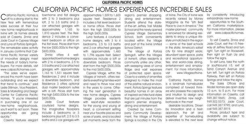 Pacific Homes is off to a strong start to the New Year with tremendous sales success at their four new home neighborhoods in Irvine with 36 homes already sold at Caserta, Zinnia and Jade Court in Cypress Village and Luna at Portola Springs®. The remarkable sales activity in January confirms that California Pacific Homes’ variety of innovative designs meet the needs of today’s homebuyers. For more details, visit www.calpacifichomes.com.