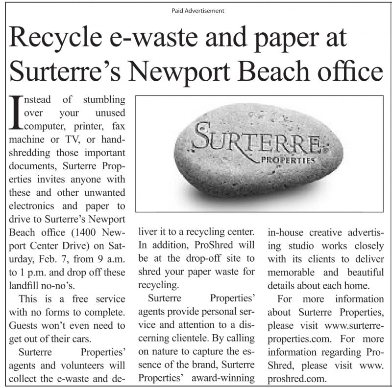 of stumbling over your unused computer, printer, fax machine or TV, or handshredding those important documents, Surterre Properties invites anyone with these and other unwanted electronics and paper to drive to Surterre’s Newport Beach office (1400 Newport Center Drive) on Saturday, Feb. 7, from 9 a.m.