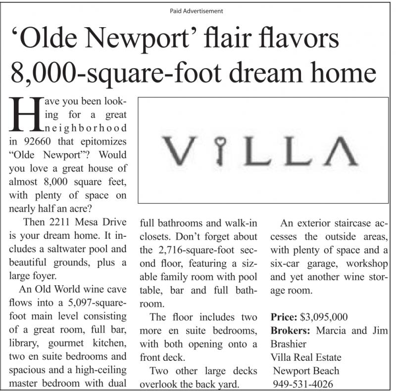Have you been looking for a great neighborhood in 92660 that epitomizes “Olde Newport”? Would you love a great house of almost 8,000 square feet, with plenty of space on nearly half an acre? Then 2211 Mesa Drive is your dream home. It includes a saltwater pool and beautiful grounds, plus a large foyer. An Old World wine cave flows into a 5,097-squarefoot main level consisting of a great room, full bar, library, gourmet kitchen, two en suite bedrooms and spacious and a high-ceiling master bedroom with dual Paid Advertisement ‘Olde Newport’ flair flavors 8,000-square-foot dream home full bathrooms and walk-in closets. Don’t forget about the 2,716-square-foot second floor, featuring a sizable family room with pool table, bar and full bathroom. The floor includes two more en suite bedrooms, with both opening onto a front deck. Two other large decks overlook the back yard. An exterior staircase accesses the outside areas, with plenty of space and a six-car garage, workshop and yet another wine storage room. Price: $3,095,000 Brokers: Marcia and Jim Brashier Villa Real Estate Newport Beach 949-531-4026 See also