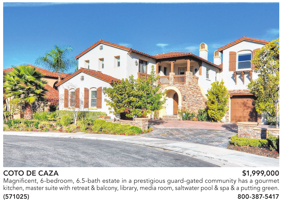 COTO DE CAZA $1,999,000 Magnificent, 6-bedroom, 6.5-bath estate in a prestigious guard-gated community has a gourmet kitchen, master suitewithretreat &balcony,library,media room,saltwaterpool&spa &aputting green. (571025) 800-387-5417