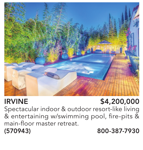 IRVINE $4,200,000 Spectacular indoor & outdoor resort-like living & entertaining w/swimming pool, fire-pits & main-floor master retreat. (570943) 800-387-7930