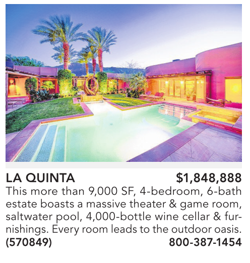 LA QUINTA $1,848,888 This more than 9,000 SF, 4-bedroom, 6-bath estate boasts a massive theater & game room, saltwater pool, 4,000-bottle wine cellar & furnishings.Every room leadstothe outdooroasis.