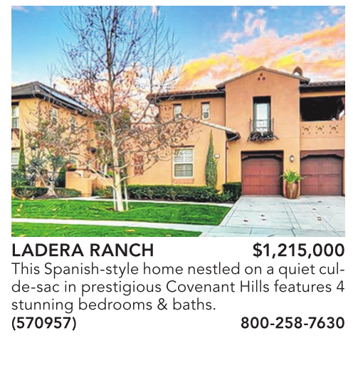 LADERA RANCH $1,215,000 This Spanish-style home nestledonaquiet culde-sac in prestigious Covenant Hills features 4 stunning bedrooms & baths. (570957) 800-258-7630